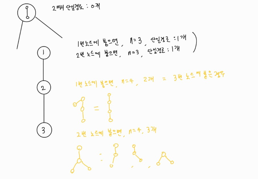 그래서 이번엔 수식을 세워야겠다는 생각을 했습니다. n은 3~50의 범위를 갖기 때문에 그 모든 경우를 다 직접 그려서 확인하는 것은 불가능한 일은 아니지만 스마트한 방법은 아니죠. 실수를 할 가능성도 높구요. 식을 세우려고 보니 어떤 노드에 달라붙느냐에 따라서 단일경로가 늘어나는 갯수에 차이가 있었습니다. 간단하게 n = 4에 대해서만 그려서 보겠습니다.