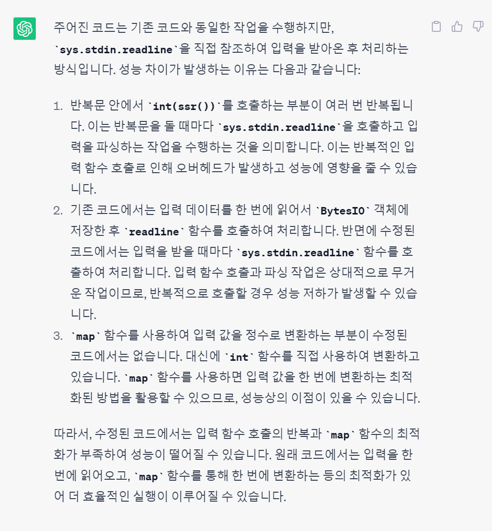 그렇게 어려운 문제는 아닌데 시간을 줄이는 방법을 좀 고민해보면 좋을 것 같습니다. 가장 빠르게 푸신 분을 보니까 BytesIO라는 메서드를 사용하셨던데 저는 잘 모르기도 하고 뭔가 연산을 빨리 가능하도록 하는 것 같습니다. 메모리에서 바로 불러오기 때문에 빠른 연산이 가능하다는데 둘 다 같은 입력을 터미널에서 받는데 어떤 부분에서 차이가 생기는지 잘 모르겠네요. 컴퓨터 관련 지식이 필요할 것 같습니다.